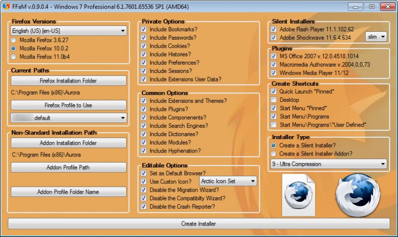 আপনার প্রোফাইলের পাসওর্য়াডগুলো যদি ইন্সটলারে না দিতে চান তাহলে Include Passwords বক্স থেকে টিক চিহ্ন তুলে দিতে পারেন। পছন্দমত কনফিগারেশন করা হয়ে গেলে টুলের সবার নিচে Create Installer বাটনে ক্লিক করুন। তাহলে FFaM আপনার পছন্দকৃত সেটিংয়ে আপনার নির্বাচিত ফায়ারফক্সটি ডাউনলোড হয়ে কাস্টম ফায়ারফক্স সাইলেন্ট ইন্সটলার হিসেবে আপনার পিসিতে সেভ হয়ে থাকবে। FFaM টুলটি ৩২ বিট এবং ৬৪ বিটের উইন্ডোজ অপারেটিং সিস্টেম সার্পোট করে!