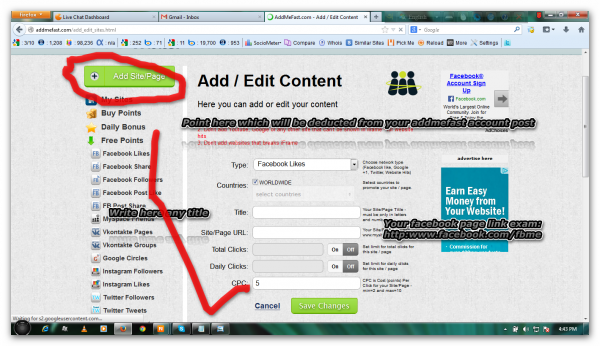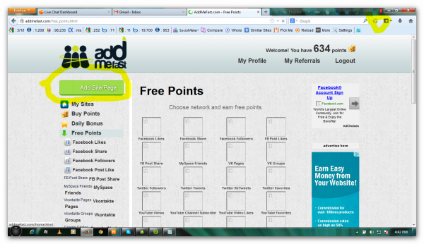 তারপর এই লিংক থেকে মজিলা ইমাক্রস এডঅন ডাউনলোড করেন নিন । এখন addmefast এর বুট গুলো কপি করে C:\Users\Your User Name\Documents\iMacros\Macros পেস্ট করুন । now again login on addmefast then এড এ সাইট বাটনে ক্লিক করে যেকোন একটি লিংক এড করে নিন । তারপর আপনি যেকোন একটা ফেইসবুক একাউন্টে লগিন করুন । এখন আপনার পয়েন্ট এড করার পালা । তবে খেয়াল করুন এটি একটি এক্সচেন্জ সাইট এর মত । আপনি একটি ফেইসবুক লাইক ,টুইটার ফলোয়ার,ইউটিউব লাইক নির্দিষ্ট এমাউন্টের পয়েন্ট পাবেন । আবার আপনি যখন কোন একাউন্টে লাইক এড করবেন সেখানে আপনার একাউন্ট থেকে অটোমেটিক কেটে যাবে । তাহলে চলুন দেখি কিভাবে আপনার বা আপনার ক্লাইন্টের পেইজ এড করবেন ।