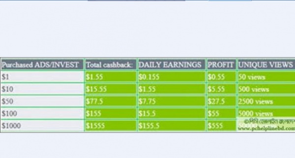 ইনভেস্ট হিসেবেঃ যারা একটু ইনভেস্ট করে মেম্বার হয়ে আয় করতে চান, তাদের জন্য রয়েছে আনলিমিটেড আয়ের সুযোগ।এখানে আপনি ইচ্ছা করলে ১$ থেকে শুরু করে যত খুশি তত ইনভেস্ট করে আয় করতে পারেন ( ইনভেস্ট বলতে এই টাকা দিয়ে আপনি আপনার সাইট বা পণ্যের জন্য এড কিনবেন )। যেমনঃ আপনি যদি ১$ ইনভেস্ট করেন তাহলে সাথে সাথে ১.৫৫$ এর এড পাবেন, তার মানে ১$ ইনভেস্ট এ সাথে সাথে ০.৫৫$লাভ যত বেশি ইনভেস্ট তত বেশি আয় ( ইনভেস্ট না করলেও আয় করতে পারবেন,ইনভেস্ট করা আপনার ইচ্ছা)।