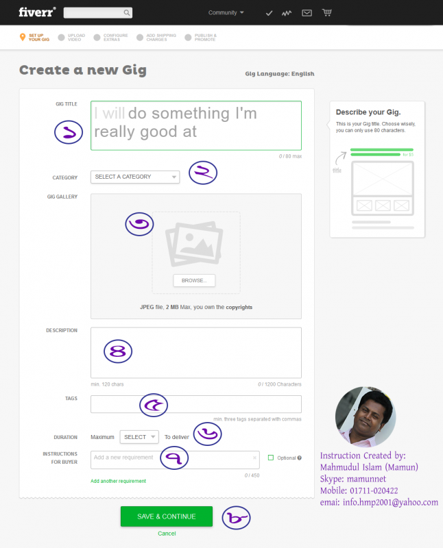 গিগ তৈরি করার জন্য লগ ইন করার পর ডান প্বাশে যেখানে আপনার আইডি সহ সবুজ রংয়ের ডলার চিহ্ন সহ একটি বক্স দেখতে পাবেন অথবা আপনার আইডির প্বাশে একটি ছোট্ট ডাউন এ্যরো দেখতে পাবেন। এবার ক্লিক করুন, একটি মিনু নিচের দিকে পুল ডাউন হবে। এরপর My Sales থেকে Create A Gig, ক্লিক করুন। এখন নিচের মত একটি পেইজ দেখতে পাবেন, আসুন প্রথমে ভালমত নিচের ছবিটি ভাল করে খেয়াল করি, আমি এখানে ক্রমানুসারে বুঝাতে চেষ্টা করেছি তাই নাম্বারের সাথে ছবির নিচের বর্ননা গুলে একটু ভালো করে পড়ুন।