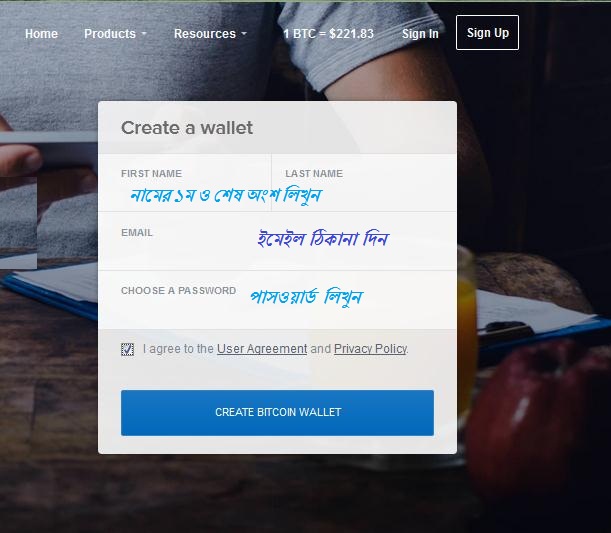 ২। এখানে Name অংশে আপনার নামের ১ম এবং শেষ অংশ দিন> Email এর বক্সে আপনার মেইল অ্যাড্রেস এবং> Password এর বক্সে আপনার পাসওয়ার্ড লিখুন> এবার সবশেষে টিক মার্ক দিয়ে Create Bit coin Wallet লিঙ্কে ক্লিক করুন।