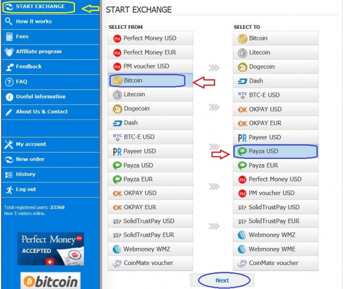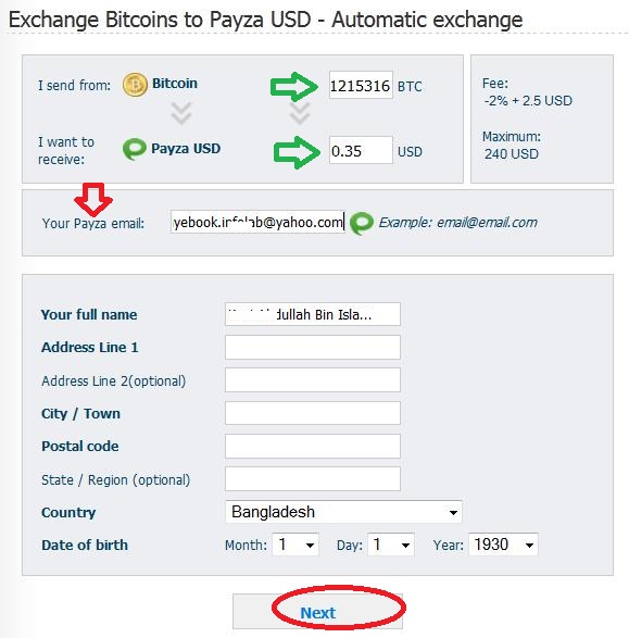 এরপর (1) Buy & Sell E-Currency তে ক্লিক করুন। তারপর (2)Select from =Bitcoin এবং Select to =Payza USD নির্ধারণ করে দিন। তারপর আপনার বিটকয়েন পরিমান (minimam 0.1 BTC) লিখে (3) Send/Next বাটনে ক্লিক করুন।