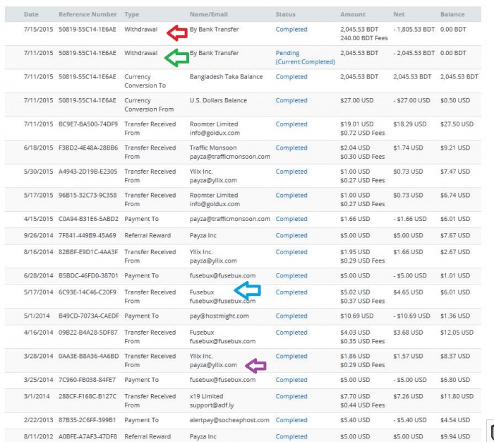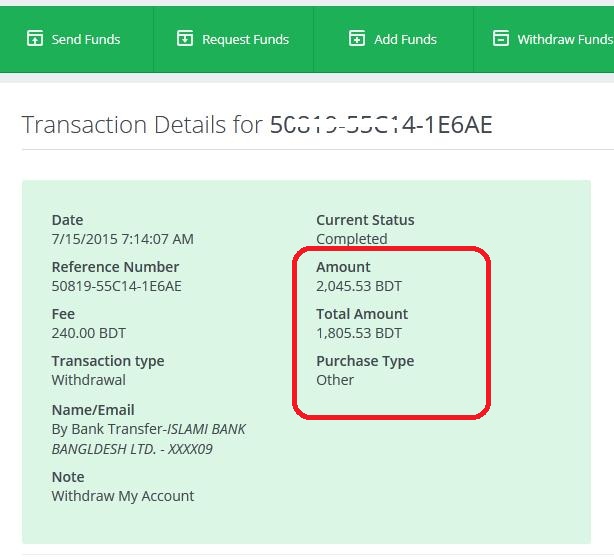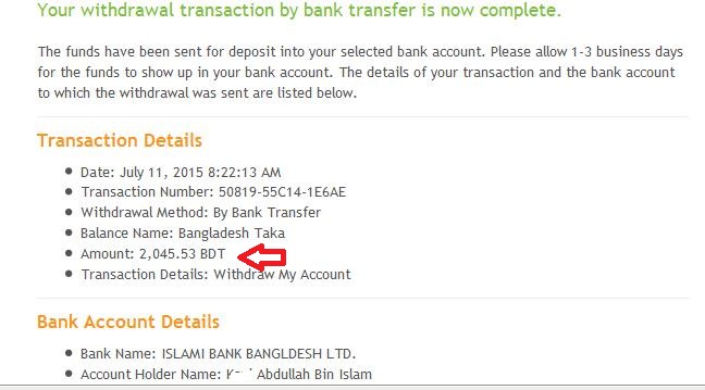 এই যেমন- ৪-৫ দিন পূর্বে আমার একাউন্টে বিভিন্ন সাইট হতে আয়কৃত অর্থ বাংলাদেশী টাকাতে প্রায় ২,০৪৫/- জমা হয় সেখান হতে আমার ইসলামী ব্যাংক একাউন্টে ট্রান্সফার করলে ২৪০/- টাকা বাদ দিয়ে ১৮০৫/- টাকা জমা হয়েছে।