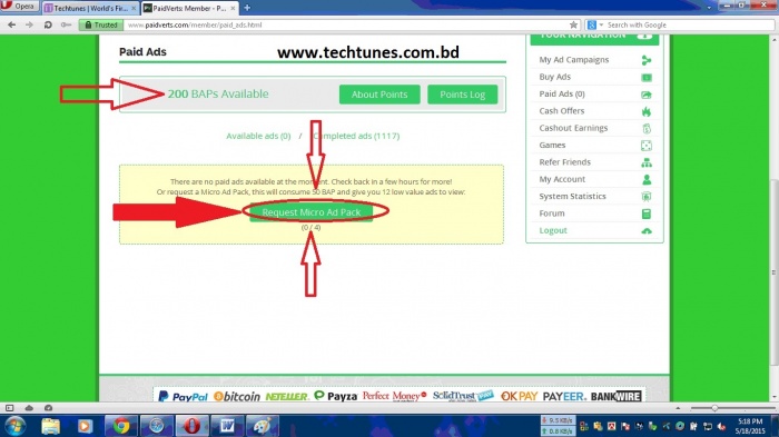 Step 17 : সবগুলো এড দেখারপর হোমপেজে আবার আসবে "Request Micro Ad Pack" নিচে লেখা ১/৪ মানে চার বারের মধ্যে ১বার রিকোয়েষ্ট করছি আপনি আবার রিকোয়েষ্ট করুন। এভাবে মোট চারবার করা যায়।