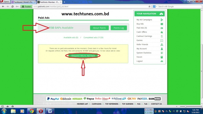 Step 11 : এখন ডলারের এড আনব ৮টি 25 BAP = 200 BAP. ডলারের এড পেতে আপনাকে "Request Micro Ad Pack" এ ক্লিক করতে হবে। আপনি ৪বার Request করতে পারবেন একদিনে। প্রতি Request এ 50 BAP নিয়ে আপনাকে ১২টি ডলারের এড দিবে যার মূল্য 0.025$ ৪বারে হবে 0.1$ মোট সময় লাগে ৪মিনিট + ১২*৪ = ৩০মিনিট। ১০দিনে এক ডলার হবে। আর গেম খেললে 0.05 দিয়ে খেললে 0.09 পাবেন্ এভাবে প্রতিদিন 10$ এর উপর আয় করতে পারবেন। "Request Micro Ad Pack" এ ক্লিক করুন।