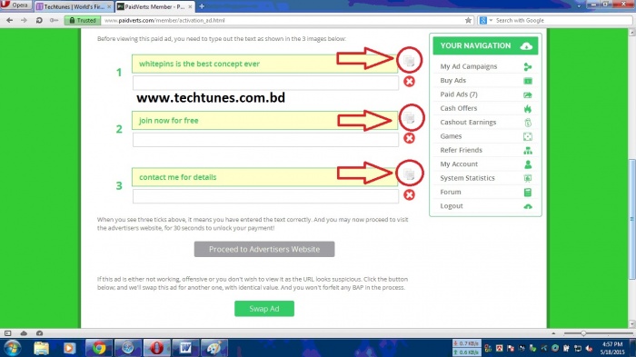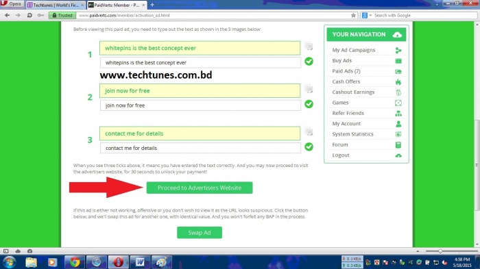 Step 15 : এবার এই ট্যাবটি ক্লোজ করেদিয়ে সামনের ট্যাবে যান। গিয়ে তিনটা লালবৃত্তের উপরের পেস্ট বাটনে ক্লিক করে "Proceed to Advertisers Website" এ ক্লিক করুন। আরেকটি ট্যাব ওপেন হলে এই ট্যাবটিও ক্লোক করে দিন।