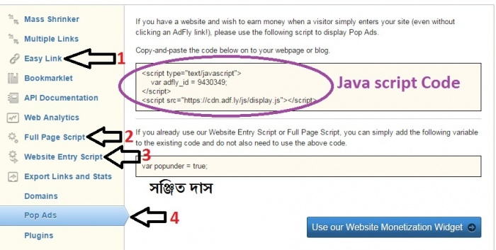 2. এডফ্লাই (Linkshrink, Easylink, Entry script, Full page script এবং Popunder Impression)