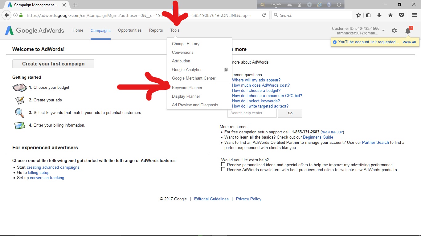 তারপর এ গিয়ে টপিক এর উপর কেমন বিড হয় তা দেখতে পারেন। আপনার ভিডিও তে যে এড শো করবে তার মূল্য কেমন হবে তা দেখতে পারেন। আমি এটাও ভিডিও তে দেখিয়েছি। প্রথমে Google Adwords এ যান গেলে নিচের ছবির মতো দেখবেন . ছবির মধ্য লাল দাগ দেওয়া অংশে ক্লিক করবেন