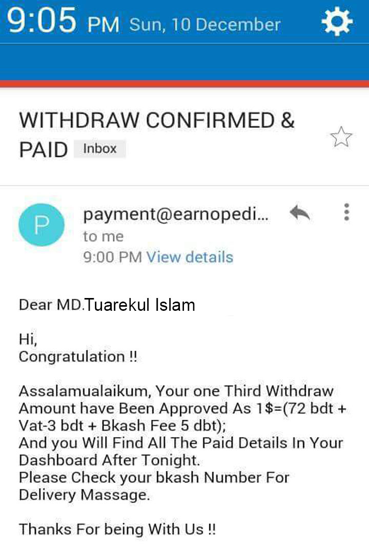 আস্সালামু আলাইকুম, সম্মানিত টেকটিউনার আজ আমি একটি বাংলাদেশি সাইট নিয়ে আলোচনা করবো, যা থেকে প্রতিমাসে ভালো টাকা ইনকাম করা যাবে।সাইটটির নাম Earnopedia। সাইটটিতে ১২ ধরনের কাজ পাওয়া যাবে।এর মধ্যে একটি হচ্ছে ভিডিও দেখে ইনকাম করা।প্রতিদিন ১৫টি ভিডিও ২ মিনিট করে মোট ৩০ মিনিটি দেখতে হয়।প্রতি ভিডিওতে 0.05$ করে 15*0.05=0.75$ পাওয়া যায়।