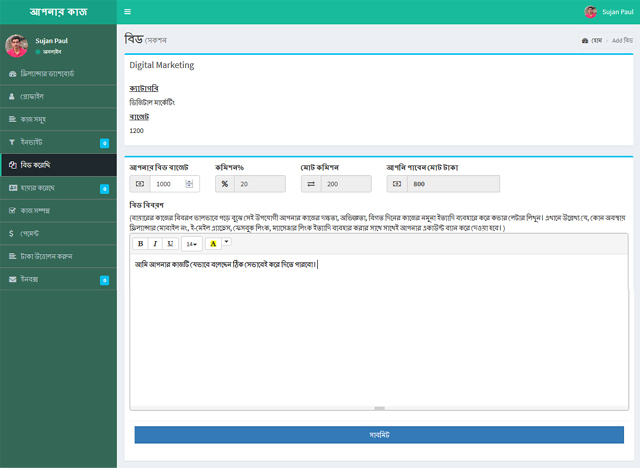ApnarKaj.com বিডের সিস্টেমটি খুবই ভালো করেছে। ‘আপনার বিড বাজেট’ এর ঘরে আপনি কত টাকায় বিড করতে চাচ্ছেন সেই এমাউন্ট বসালেই অটোমেটিকভাবে কোম্পানীর কমিশন ও একজন ফ্রিল্যান্সার কত টাকা পাবে সব হিসাব বেরিয়ে যাবে। নিচে আপনার বিডের বিবরণ লিখে সাবমিট বাটনে ক্লিক করলেই বিড কমপ্লিট হয়ে যাবে।