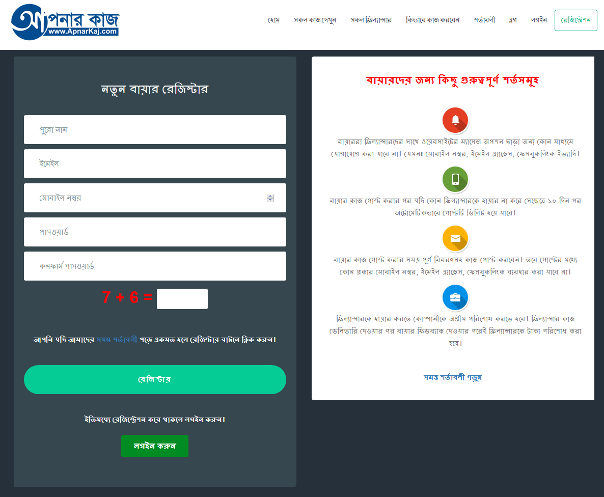 যারা নতুন বায়ার তারা শর্তাবলীগুলো ভালোভাবে পড়ে নিচের ফরমটি পূরণ করবেন। পরবর্তীতে আপনার দেওয়া ই-মেইল এড্রেসে একটি একটিভেশন লিংক পাঠাবে। লিংকে ক্লিক করে একাউন্ট একটিভ করতে হবে। একাউন্ট একটিভ করার পর আপনার অথবা আপনার কোম্পানীর ছবি দিন এবং নিজের সম্পর্কে বা কোম্পানী সম্পর্কে লিখে একাউন্ট ১০০% করুন। তারপর কাজ টিউন করুন।