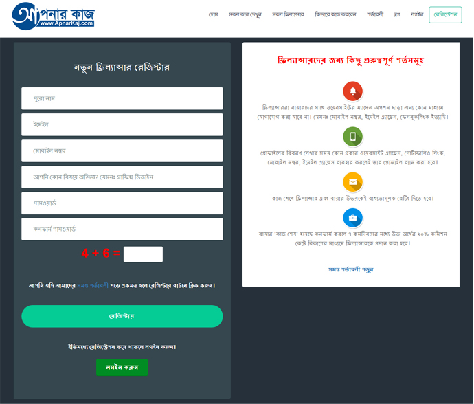 যারা নতুন ফ্রিল্যান্সার তারা শর্তাবলীগুলো ভালোভাবে পড়ে নিচের ফরমটি পূরণ করবেন। পরবর্তীতে আপনার দেওয়া ই-মেইল এড্রেসে একটি একটিভেশন লিংক পাঠাবে। লিংকে ক্লিক করে একাউন্ট একটিভ করতে হবে। একাউন্ট একটিভ করার পর আপনার ছবি দিন এবং নিজের সম্পর্কে লিখে একাউন্ট ১০০% করুন। তারপর কাজে লেগে পড়ুন।