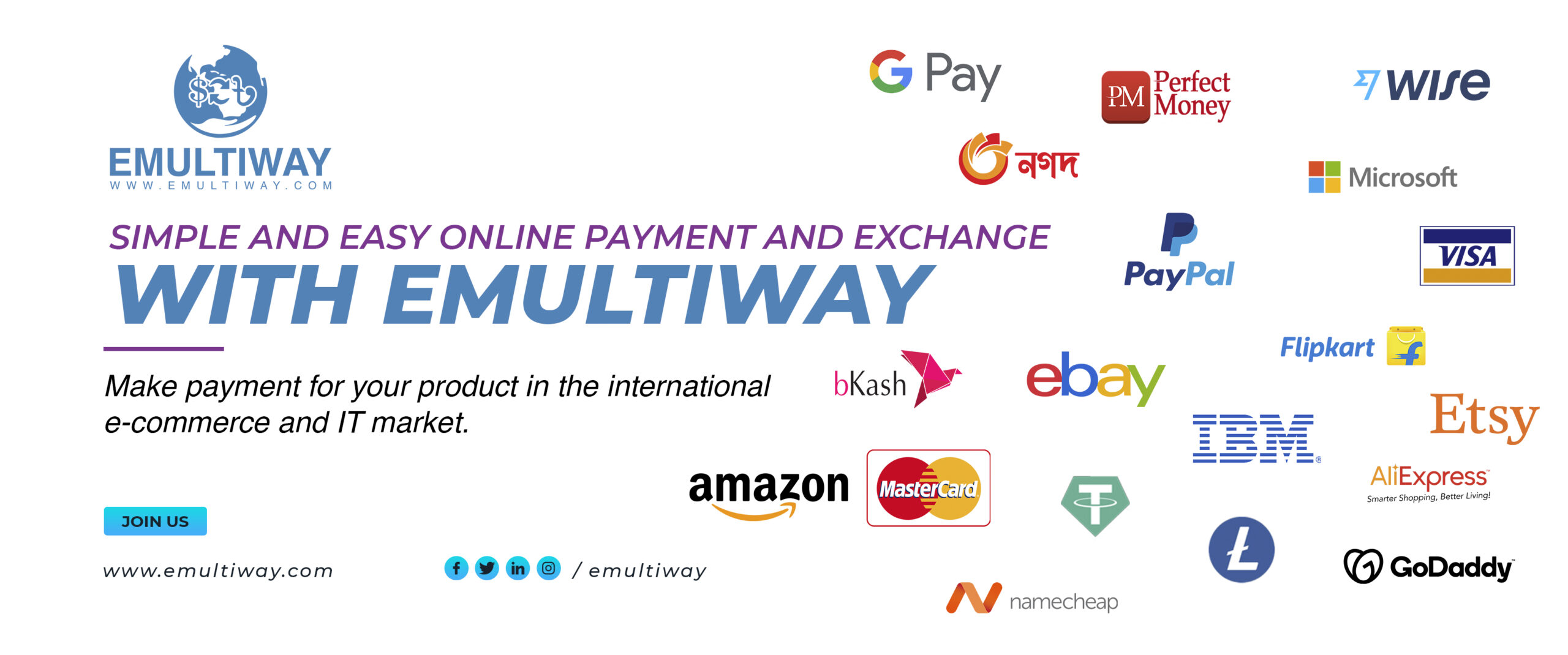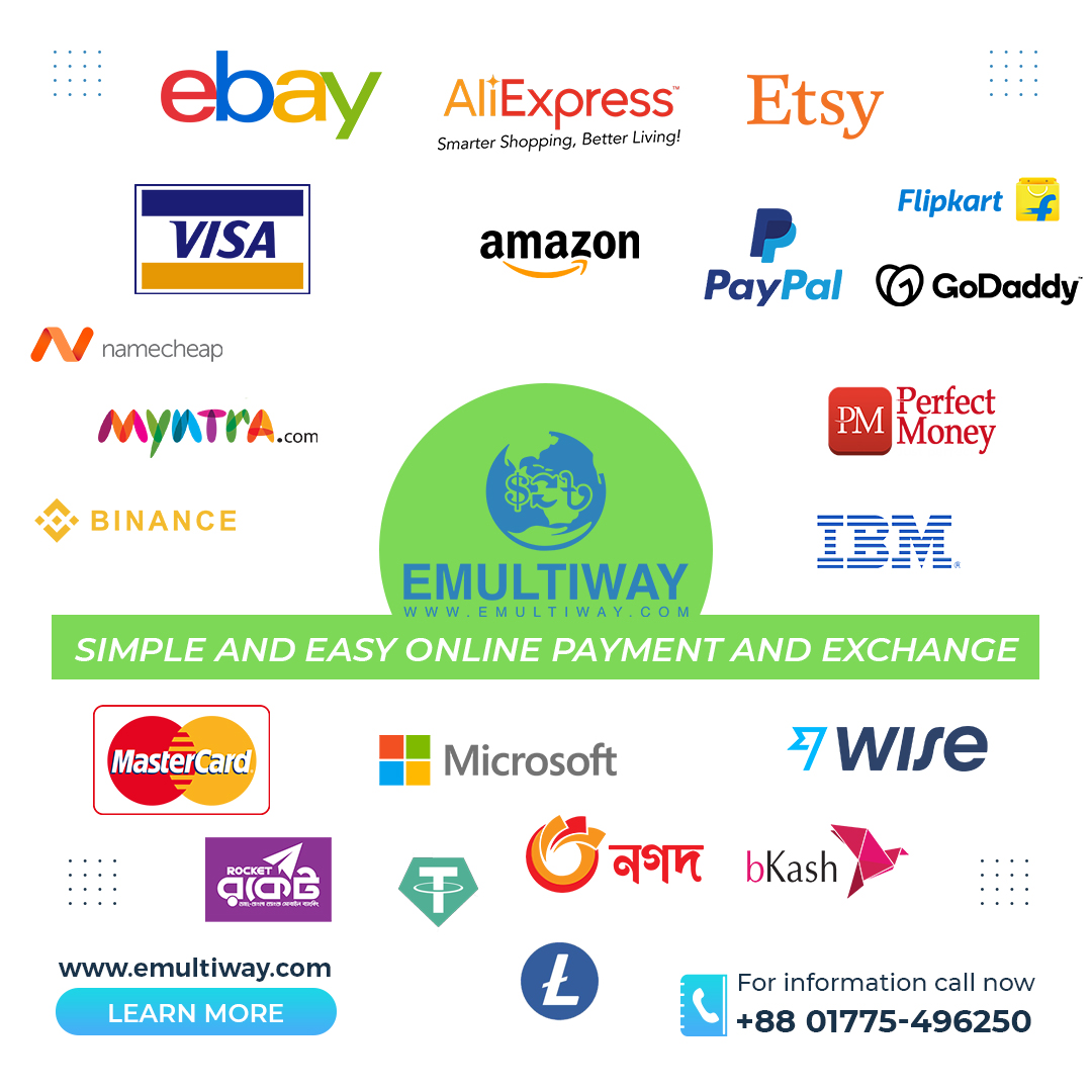 এছাড়াও বিশ্বের যে কোনো ইকমার্স সাইড যেমন: Amazon, eBay, Walmart, Etsy সহ বিভিন্ন সাইড থেকে পন্য ক্রয়ের ক্ষেত্রে পেমেন্ট করার সুবিধা নিয়ে আপনার পাশে আছে EMultiway