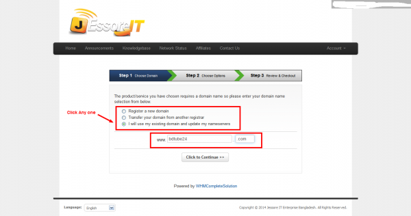 এখান থেকে ৩য় অপশনটি সিলেক্ট করুন আপনার ডোমেনটি দিন( চিত্র অনুযায়ী) এবং Click to Continue তে ক্লিক করুন।