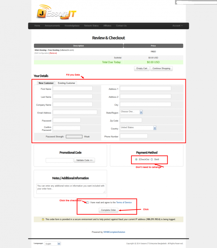 নিন্মের ফরমটি পুরন করুন এবং Pament Method দুইটি থেকে যে কোন একটি সিলেক্ট করুন, (I have read and agree to the Terms of Service ) টিক দিন এবং complete order এ ক্লিক করে আপনার ফ্রি Hosting Order Complete করুন।