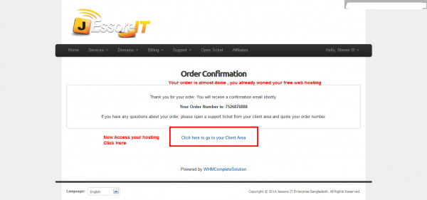 উপরের পেজটি সঠিক ভাবে পুরন করা হলে Order confirmation পেজটি দেখতে পাবেন। Click here to go to your Client Area তে ক্লিক করুন