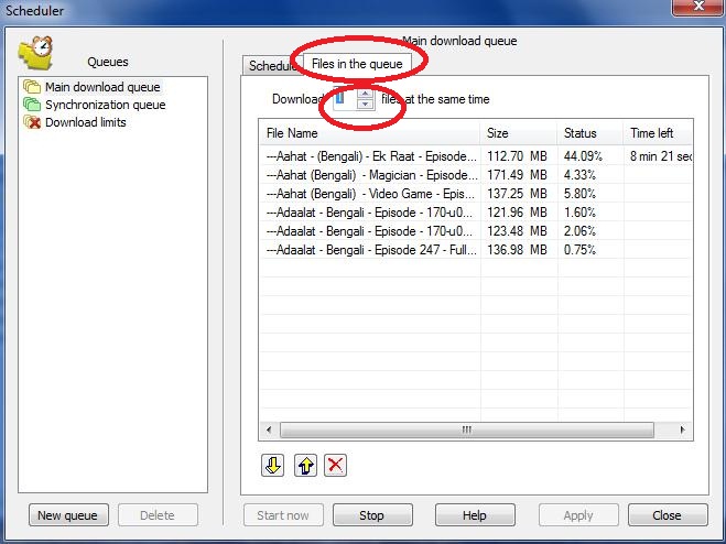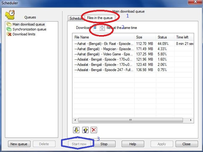 ২। এবার উপরের files in the queue এ ক্লিক করুন । DOWNLOAD file at the same time এ- 1 করে দিন । এবার নিচের apply button এ ক্লিক করুন । যে যে ফাইল pause করে রেখেছিলেন নিচে সেই ফাইল গুলো আসবে ।