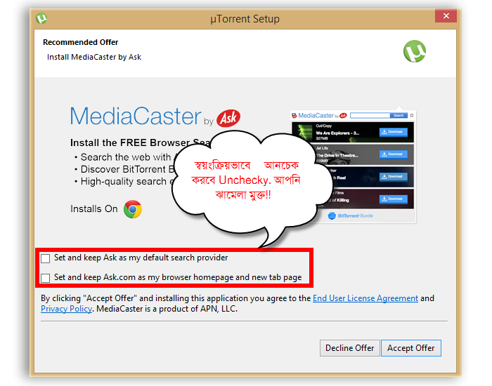 কম্পিউটারে সফটওয়্যার ইনস্টলেশনের সময় আমরা খুব কম সময়েই সচেতন থাকি। যারফলে একটা সফটওয়্যার ইনস্টল করতে গিয়ে অনাকাঙ্খিত আরও কয়েকটা সফটওয়্যার কিংবা টুলবার ডাউনলোড কিংবা ইনস্টল করে ফেলি। সাধারনত আমরা ফ্রিওয়্যারগুলোর প্রতি বেশি ঝুকি। কিন্তু অধিকাংশ এডওয়্যার গুলো ফ্রি সফটওয়্যারের মাধ্যমে বেশি ছড়িয়ে পড়ে। যার ফলে দেখা যায় ওয়েব সাইট ব্রাউজিং কিংবা কম্পিউটারের স্বাভাবিক কাজ করার সময় সেগুলো যন্ত্রনা দিতে শুরু করে। আপনার হয়তো প্রায় সবাই Ask টুলবার সম্পর্কে জানেন। আমি যখন কম্পিউটারে প্রথম দিকে ইন্টারনেট ব্যবহার করতাম তখন এই টুলবার খুব যন্ত্রনা দিতো। আনইনস্টল করলেও অনেক সময় যন্ত্রনা থেকে রেহায় পাওয়া যেতো না। ব্রাউজারের হোম পেইজ, সার্চ ইঞ্জিন সব Ask টুলবারময় হয়ে থাকতো। এই ধরনের যাবতীয় সমস্যা থেকে মুক্তি দিতেই মুলত আমার আজকের টিউনের অবতারনা। আজ আমরা দেখবো, কীভাবে অনাকাঙ্খিত সফটওয়্যার ইনস্টল হয় এবং কীভাবে এর থেকে মুক্তি পাওয়া যায়।