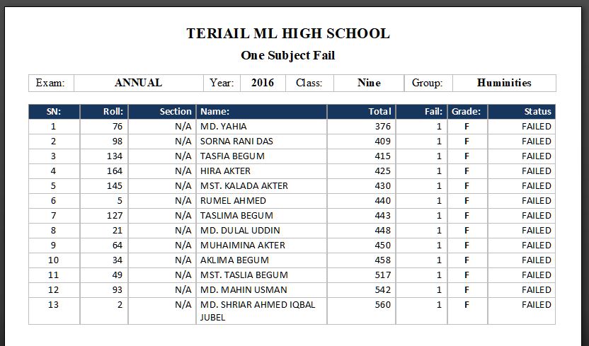 • ১ থেকে ৪ বিষয়ে অকৃতকার্যদের আলাদা তালিকা প্রিন্ট করার ব্যবস্থা