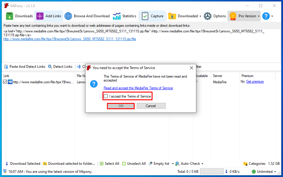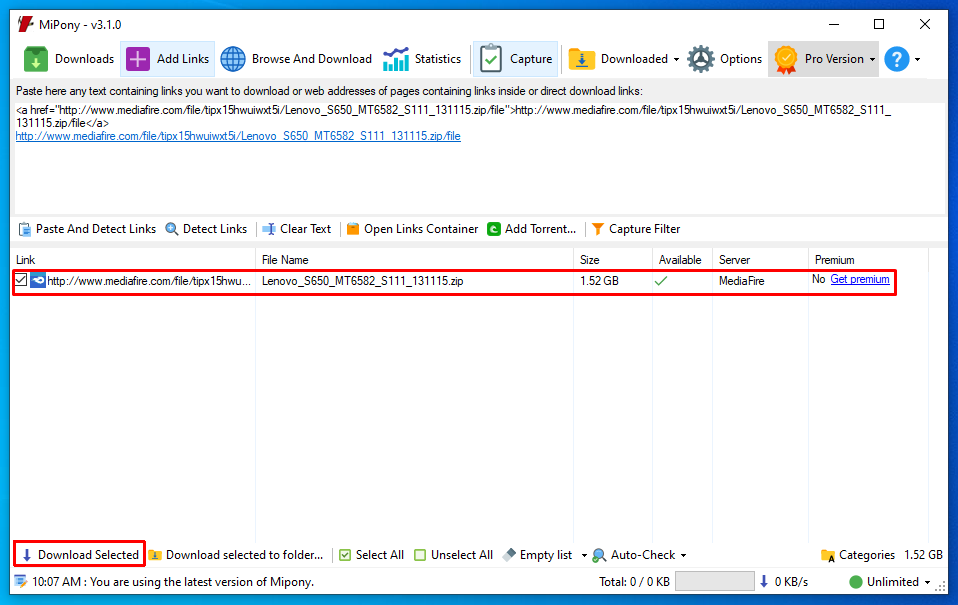 আপনি যে লিংক থেকে ডাউনলোড করতে চান তা এখানে পেস্ট করুন। আপনি যে লিংক পেস্ট করেছেন সেই ডাউনলোড সাইট যদি Mipony সাপোর্ট করে তাহলে আপনি ডাউনলোড লিংক, ফাইলের নাম, ফাইলের সাইজ এবং স্ট্যাটাস ফাইলের নিচে দেখতে পাবেন। আমি টেস্ট করার জন্য Mediafire ডাউনলোড লিংক ব্যবহার করেছি, এটি সিঙ্গেল লিংক থেকে ফাইলের সমস্ত তথ্য সঠিকভাবে কালেক্ট করতে পারে আর এর অর্থ হচ্ছে এই ফাইলগুলি ডাউনলোডার দিয়ে ডাউনলোড করতে পারবেন, এছাড়াও ভাল ইন্টারনেট কানেক্টশন, শিডিউলিং এবং স্পীড লিমিট করে ফাইল ডাউনলোড করতে পারবেন।
