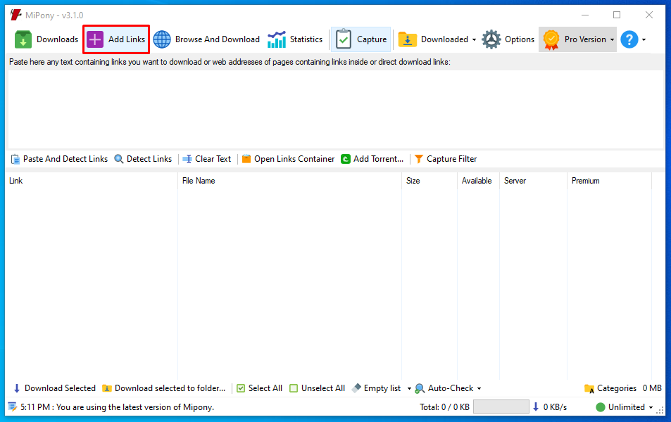 আপনি যদি ম্যানুয়ালি ফ্রী ডাউনলোডের জন্য একটি URL যুক্ত করতে চান তাহলে উপরের বাম কর্নারে "Add Link" বাটনে ক্লিক করুন। যাইহোক, Mipony ডাউনলোডারের বিল্ট ইন ব্রাউজার ফাংশন রয়েছে। আপনি যদি ব্রাউজ করার সময় ডাউনলোড কতটুকু হয়েছে তাও দেখতে চান তাহলে এই ডাউনলোডার সফটওয়্যার কে ব্রাউজার হিসেবেও ব্যবহার করাতে পারেন।
