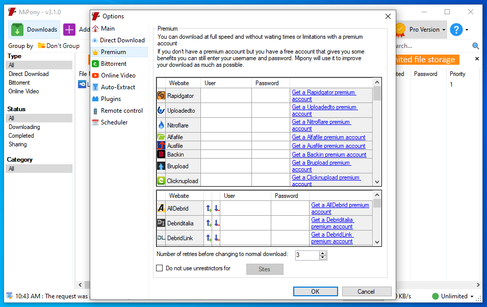 আমি আপনাদেরকে আগেই বলেছিলাম যে, আপনার যদি ঐসব ফ্রী ডাউনলোড সাইটে প্রিমিয়াম অ্যাকাউন্ট থাকে Mipony তা সাপোর্ট করে। আপনার যদি পেইড অ্যাক্সেস থাকে এবং দ্রুত ডাউনলোড স্পীড অথবা সীমাবদ্ধতা সেট করতে চান তাহলে আপনি Mipony তে আপনার অ্যাকাউন্ট ইনফরমেশন ইনপুট করে প্রিমিয়াম ডাউনলোড স্পীড উপভোগ করতে পারবেন।