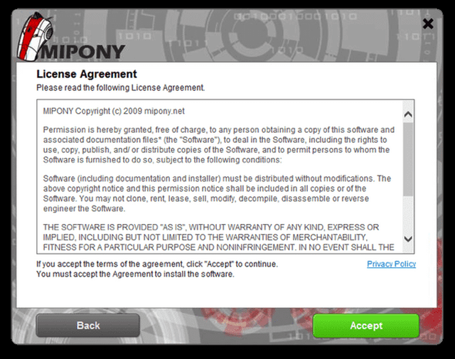 Mipony এর অফিসিয়াল ওয়েবসাইট থেকে সফটওয়্যার ইন্সটলারটি ডাউনলোড করে নিন। ডাউনলোড করা হয়ে গেলে, ইন্সটলারটিতে ডাবল ক্লিক করুন, তাহলে ইন্সটলার স্ক্রিনটি ওপেন হবে। এখন, ইন্সটলেশন শুরু করতে "Next" বাটনে ক্লিক করুন। এখন আপনি সফটওয়্যার এর লাইসেন্স এগ্রিমেন্ট পেইজ দেখতে পাবেন সেখান থেকে "Accept" বাটনে ক্লিক করুন।