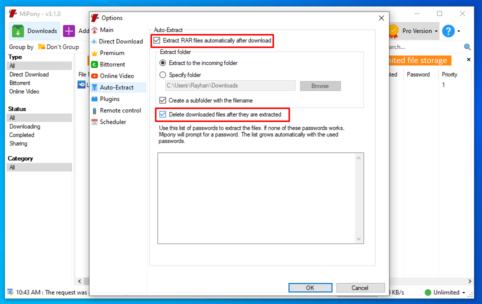 Mipony সত্যিই অনেক স্মার্ট, কারণ এর বিল্ট ইন "auto decompression" ফাংশন রয়েছে। কোন ফাইল ডাউনলোড হয়ে গেলে, ফাইলটি পাওয়ার জন্য এটি অটোমেটিক্যালি একটি প্রি-সেট ডি-কম্প্রেশন পাসওয়ার্ড সেট করতে পারে। আর একই সাথে আপনার হার্ড ডিস্কের জায়গা বাচাতে ডি-কম্প্রেশন করার পরে মেইন ফাইলটি ডিলিট করে দিবে।