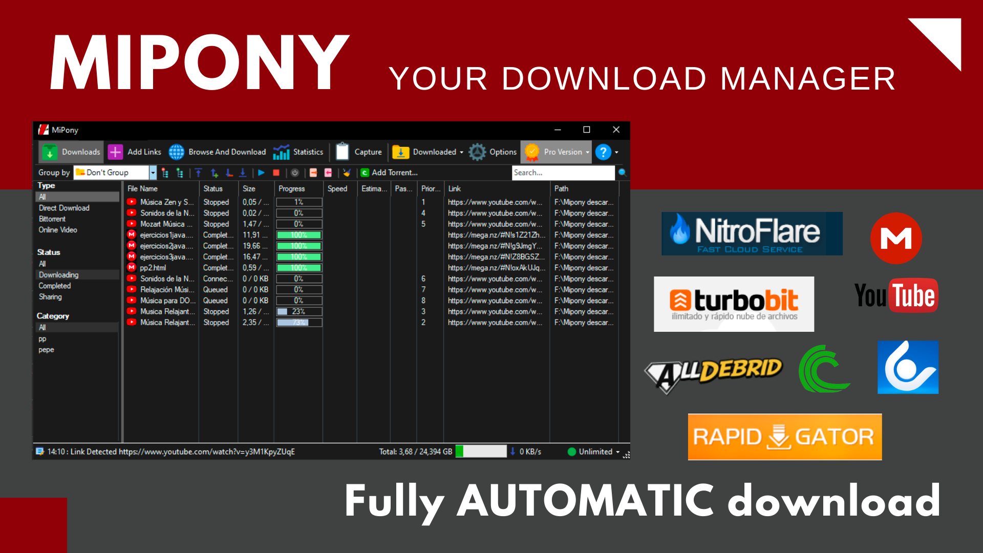 Mipony ব্যবহার করে একটি একটি করে অনেক গুলো ফাইল ডাউনলোড করার পরিবর্তে একত্রে সবগুলো ফাইল ডাউনলোড করতে পারবেন, এতে আপনার প্রচুর সময় সাশ্রয় করতে পারবেন এবং একটি ডাউনলোড শেষ হলে অন্য শুরু করার জন্য হিসাব নিকাশও করতে হবেনা। আপনার ইন্টারনেট ডিসকানেক্ট হয়ে গেলে, ওয়েব ব্রাউজার তখন আবার শুরু থেকে ডাউনলোড করা শুরু করবে, কিন্তু Mipony দিয়ে ডাউনলোড করলে আপনি এই সমস্যার পরবেন না, এবং অপ্টিমাইজিং এবং আপনার ইন্টারনেটের স্পীড ভাল হলে অল্প সময়ের মধ্যেই ডাউনলোড করতে পারবেন।
