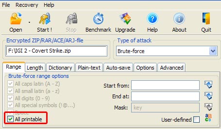 > Brute-force Range অপশনে All Printable টিক চিহ্ন দাও।