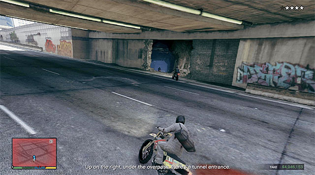 তারপর স্টোর থেকে বেরিয়ে এসো এবং Dirt Bike (Maibatsu Sanchez) তে করে সেখান থেকে পালিয়ে আসো। তবে খেয়াল রাখো যে তোমার পিছে অলরেডি ৪ তারকার পুলিশ লেগে গেছে। এবার ফ্র্যাঙ্কলিন এর চরিত্রে সুইচ করে তার স্পেশাল স্কিলের সৎ ব্যবহার করে পুলিশের তাড়া হতে পালানো চেষ্টা করো। হাইওয়েতে আসার পর নিচের চিত্রের টানেলে প্রবেশ করো।