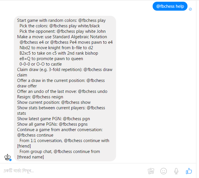 তবে কথা হল এই দাবা বোর্ড এ দাবার গুটি এক ঘর থেকে অন্য ঘরে সরাতে আপনাকে একটু কৌশল অবলম্বন করতে হবে। এর জন্য ওই চ্যাট উইন্ডোতেই @fbchess help লিখে সেন্ড করুন। ফেসবুক আপনাকে বলে দিবে কিভাবে কি করতে হবে।
