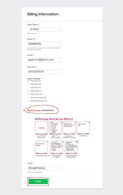 (বিশেষ কথা: আপনি যদি ভুল TrxID Number দিয়ে থাকেন তাহলে আপনি কোন ডায়মন্ড পাবেন না। তার জন্য BDdiashop দায়ী নয়। )