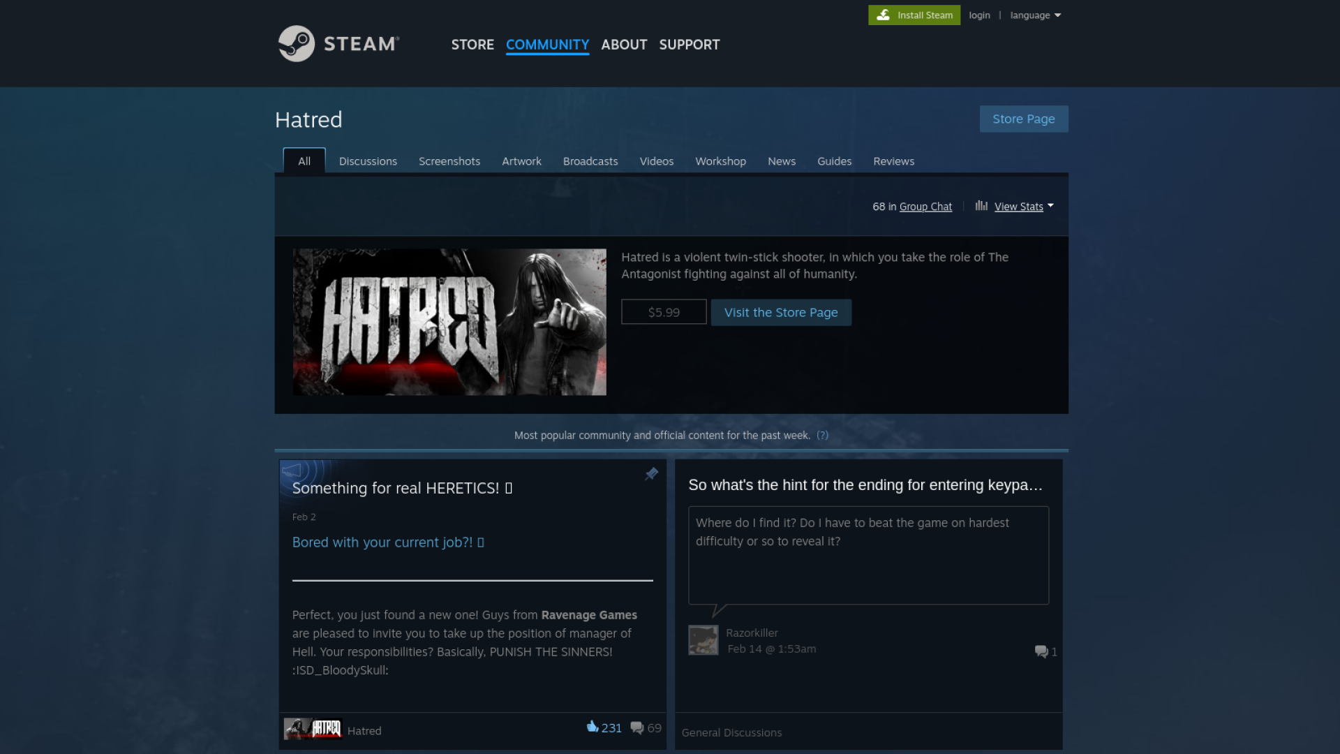 Hatred ভিডিও গেম যা ২০১৫ সালে পাবলিশ হয়েছিল। এটি Destructive Creations ডেভেলপাররা তৈরি করেছিলো। Hatred একটি কন্ট্রোভারসিয়াল গেম হিসেবে পরিচিত।