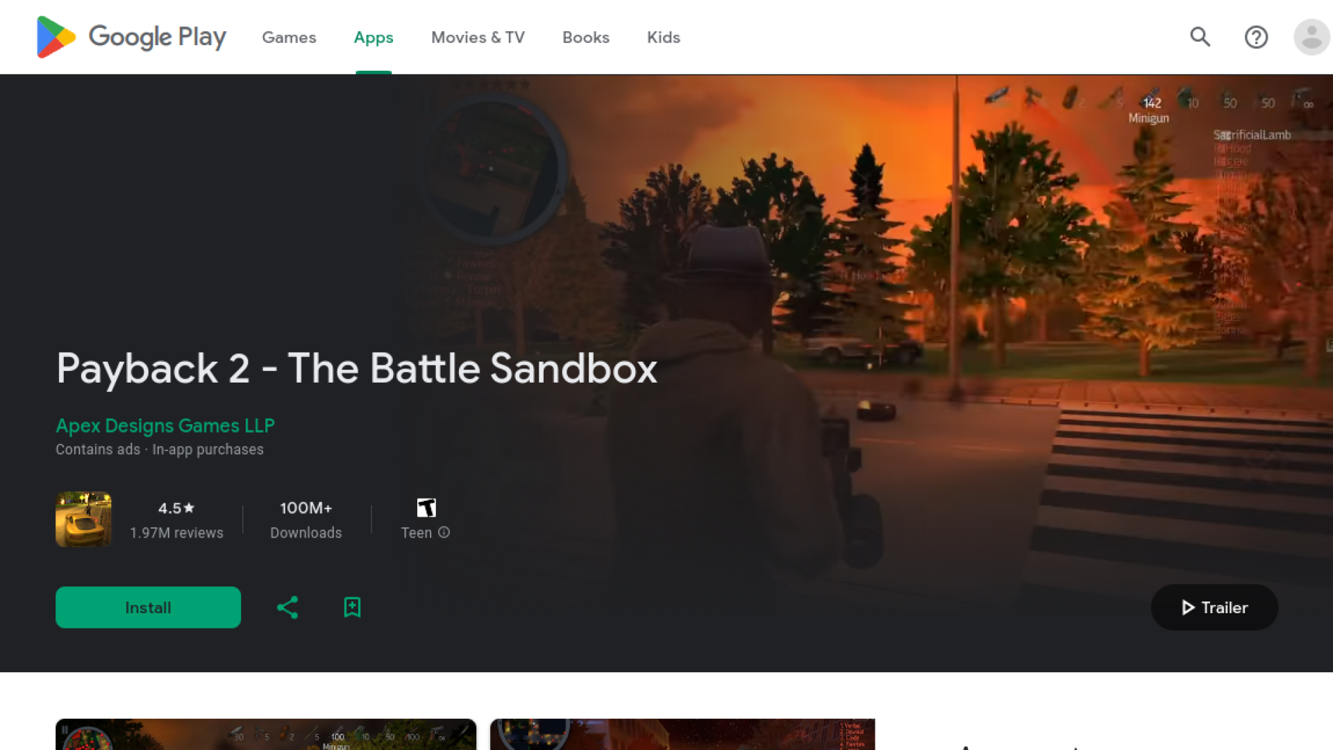 Payback 2: The Battle Sandbox একটি জনপ্রিয় অ্যান্ড্রয়েডের গেম। গেমটি জনপ্রিয় গেম ডেভেলপমেন্ট কোম্পানি Apex Designs বানিয়েছেন। গেমটি প্লে-স্টোরে ১৪ অক্টোবর ২০১০ সালে রিলিজ করা হয়েছিলো। আপনাদের মধ্য যারা GTA Type গেমগুলো অনেক বেশি পছন্দ করেন তাদের কাছে Payback 2 : The Battle Sandbox গেমটিও অনেক পছন্দের একটি গেম হবে। কারণ এই গেমটির ম্যাপ আইডিয়া, একশন আইডিয়া, চ্যালেঞ্জিং আইডিয়া সবগুলো প্রায় GTA গেমের মতোই। আলাদা অন্যন্য গেমের থেকেও এই গেমটিতে পাবেন অসংখ্য সব জনপ্রিয় গেম মুড যা আপনি আপনার ইচ্ছামতো খেলতে পারবেন।