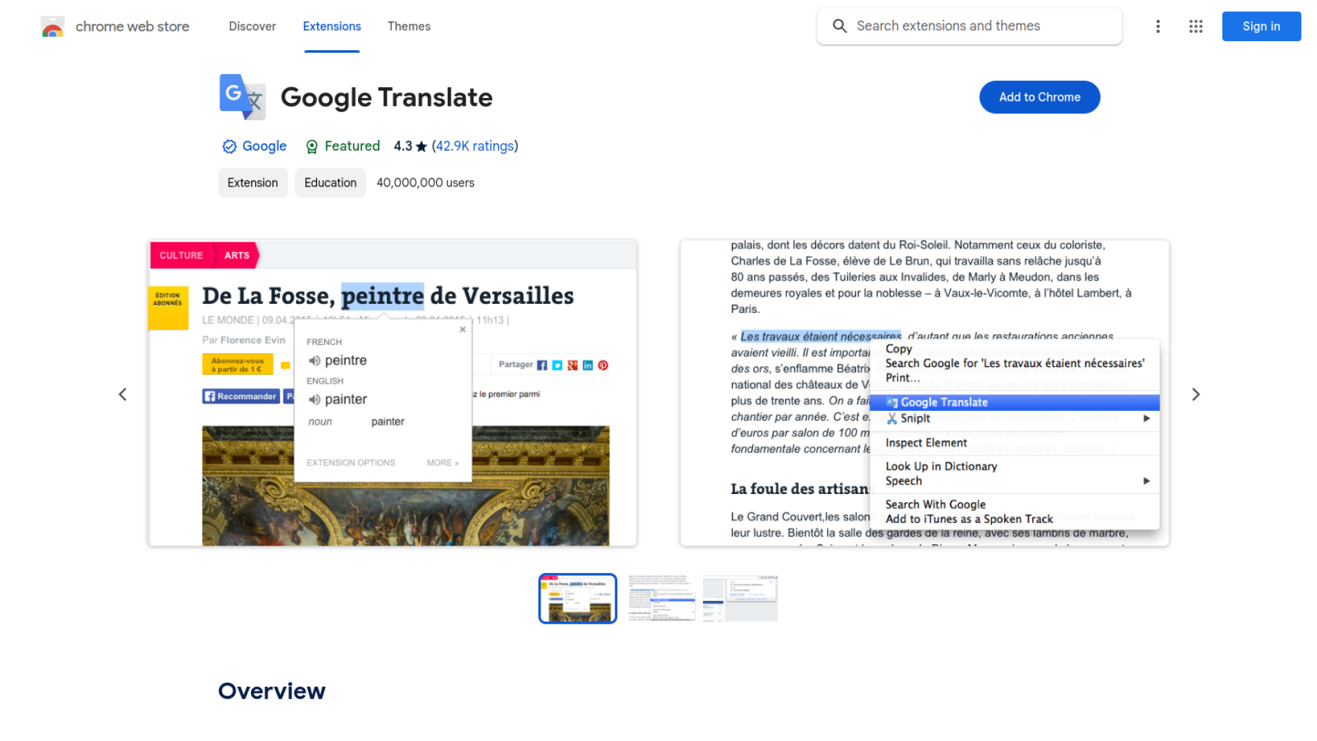 Google Translate হল একটি ভাষা অনুবাদ ব্রাউজার এক্সটেনশন যা আপনাকে বিভিন্ন ভাষায় অনুবাদ করতে সহায়তা করবে। এটি আপনার বিদেশ ভ্রমণের জন্য অথবা অন্য ভাষা শিখতে সহায়ক হতে পারে। গুগল ট্রান্সলেট (Google Translate) এর কাজ হলো একটি ভাষার লেখা বা বাক্য কে অন্য যেকোনো ভাষায় রুপান্তর (Translate) করা। অর্থাৎ আপনি যদি কিছু শব্দ বাংলায় অনুবাদ করতে চান তাহলে সহজেই আপনি সেটি গুগল ট্রান্সলেট (Google Translate) এর মাধ্যমে করে নিতে পারবেন। এতে আপনাকে আলাদা কোনো প্রকার ঝামেলা করতে হবে না। তাছাড়া আপনি গুগল ট্রান্সলেট (Google Translate) সম্পূর্ণ ফ্রিতেই ব্যবহার করতে পারবেন। গুগল ট্রান্সলেট ব্যবহার করার জন্য আলাদা কোনো অর্থের প্রয়োজন নেই।
