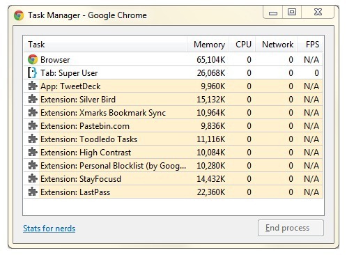 এই সুবিধাটা যাদের জন্য অসুবিধা হয়ে দাঁড়িয়েছে তাদের জন্য ক্রোম আরেকটা অতিরিক্ত সুবিধা দিয়েছে যা অন্য ব্রাউজারে নাই। সেই ইউনিক সুবিধাটা হল ক্রোমের নিজস্ব Task Manager যার সাহায্যে অ্যাক্টিভ ট্যাব, ওয়েব প্লাগিন এবং Extension গুলো দেখতে পাবেন আর মন চাইলে অফ করে দিতে পারবেন।