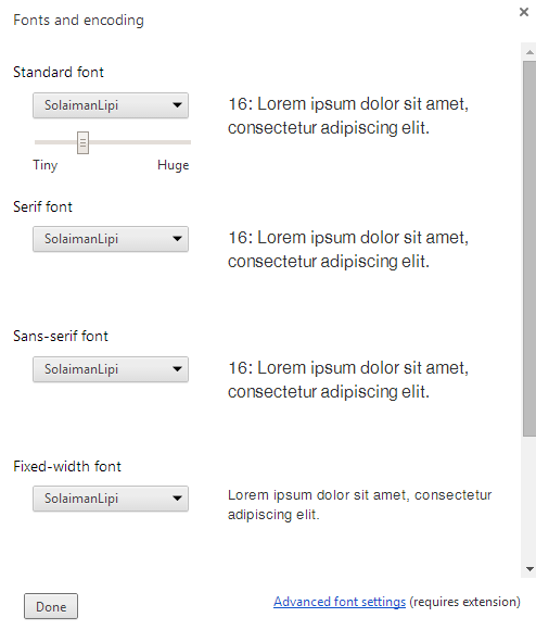 ১. আপনার এড্রেসবারে chrome://settings/fonts লিখে Enter দিন অথবা সেটিং থেকে ম্যানুয়ালী সেটিংস এ গিয়ে advanced settings এ ক্লিক করে Web Content থেকে Customized Fonts… এ ক্লিক করুন