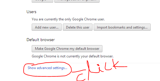 আসসালামু আলাইকুম। হিন্দু ভাইদের আদাব। আর অন্যদের শুভেচ্ছা জানিয়ে সুরু করছি আজকের পোস্ট। কাজের জন্য অনেক ওয়েবসাইট এ রেজিস্ট্রেশান করতে হই এবং সব পাসওয়ার্ড মনে রাখা সম্ভব নয় বলে আমরা পাসওয়ার্ড গুলো ব্রাউজার এ সেভ করে রাখি। কিন্তু কোন কারনে যদি আপনি কি পাসওয়ার্ড দিএছেন ওটা জানা দরকার হয় সেক্ষেত্রে সেই পাসওয়ার্ড গুগল ক্রম থেকে কি করে বের করতে হয় আজ তা শিখে দিচ্ছি। এর জন্য আপনার গুগল ক্রম ব্রাউজার এর সেটিং এ যান এবং নিছের ছবির মতো show advanced setting এ ক্লিক করুন।