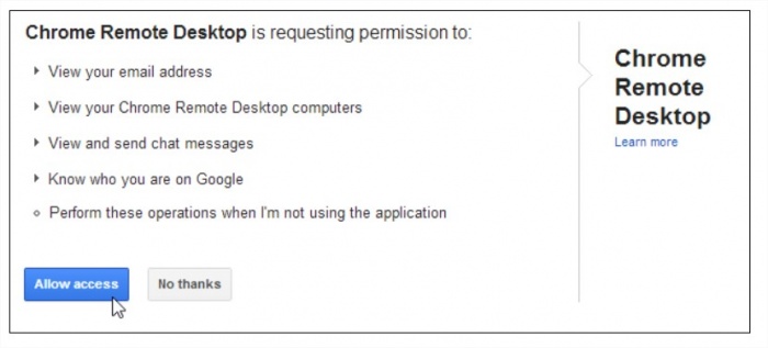 এটা আপনি প্রথমবারের মত আপনার পিসিতে ক্রোম রিমোট ডেক্সটপ ইউজ করছেন। তাই, প্রথমবার আপনার পিসি একসেস করার জন্য আপনাকে অনেক পারমিশন এলাও করতে হবে। প্রথমে কনটিনিউ বাটনে চাপ দিন। এই কারণে তারপর আপনার গুগল একাউন্টে সাইন ইন করুন এবং এলাও একসেস বাটনে ক্লিক করুন।।বুঝতে না পারলে নীচের চিত্রটা ফলো করুন। নীচের চিত্রের মত করে