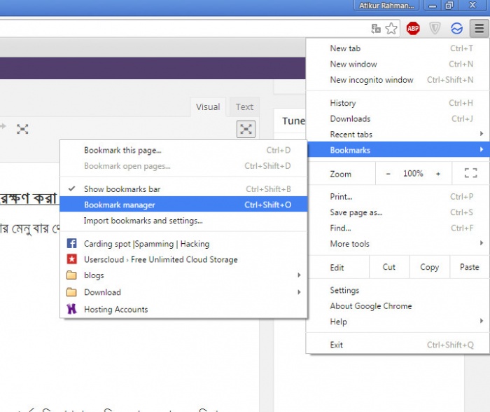 প্রথমেই গুগল ক্রোম বাউজারে প্রবেশ করুন। একদম উপরের ডান কোণার মেনু বার থেকে Bookmarks এ গিয়ে Bookmarks Manager এ ক্লিক করুন। নিচের মতো করে।