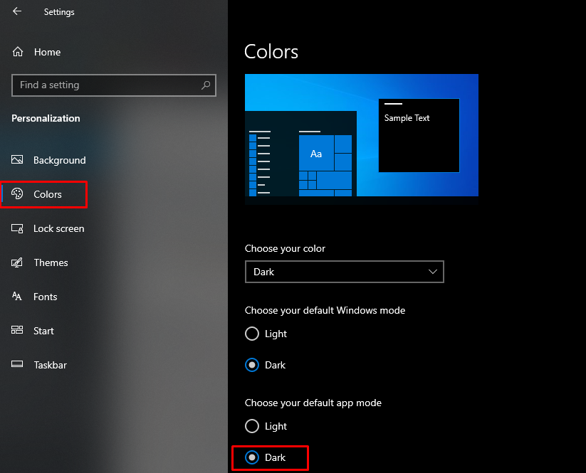 প্রথমত, আপনি Windows 10 এর সেটিংস মেনুতে যান, তারপর 'Personalization' অপশন সিলেক্ট করুন এরপর 'Colors' অপশনে ক্লিক করুন এবং 'Choose your default app mode' অপশনে যান।