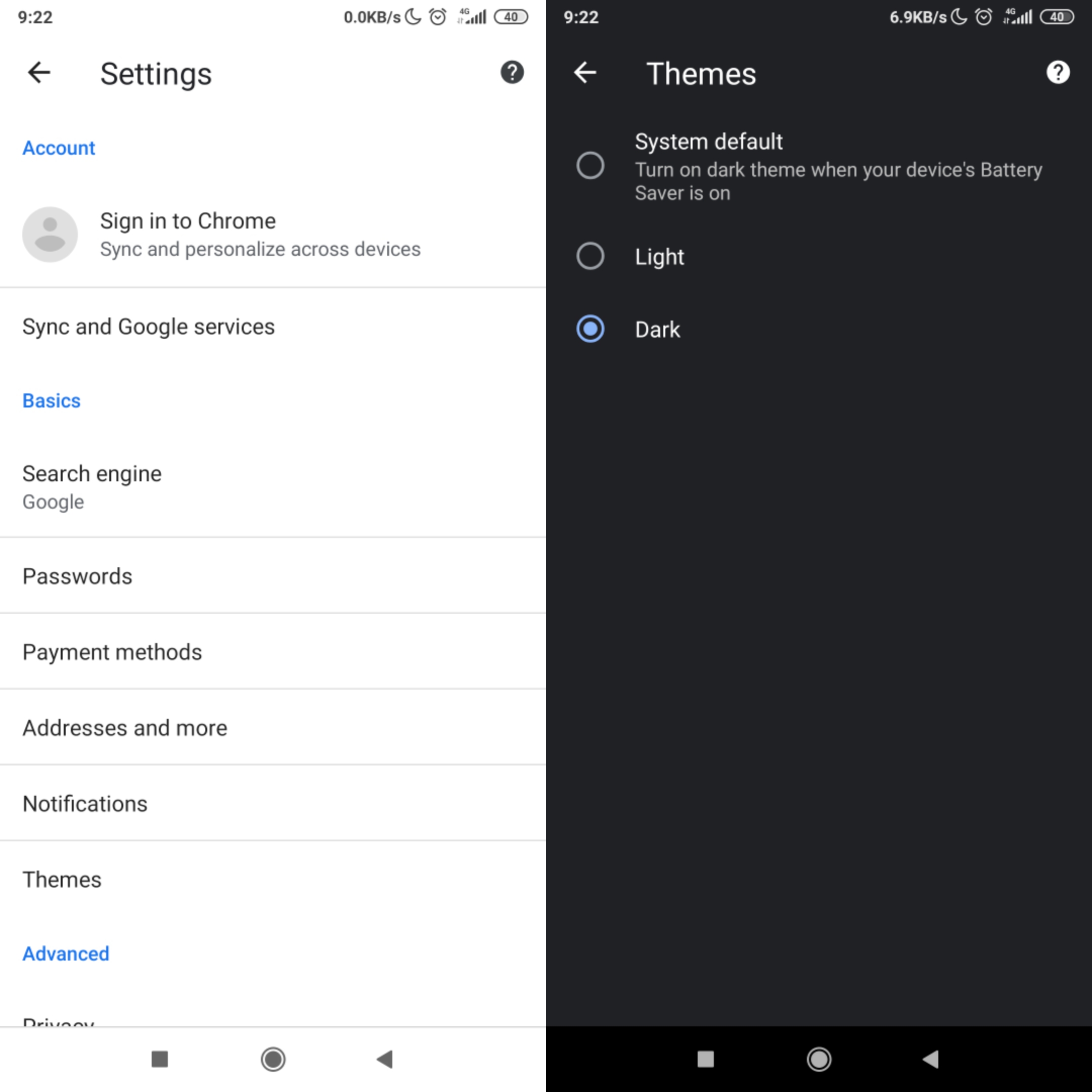 ৪. এখন, ক্রোমের সেটিংস মেনুতে যান, সেখান থেকে 'Themes' এ যান এবং 'dark ' সিলেক্ট করুন। আপনি যদি Themes অপশনটি দেখতে না পান তবে ক্রোমটি আবার ক্লোজ করে চালু করুন এবং এর পরে অবশ্যই এই অপশনটি আপনি খুঁজে পাবেন।