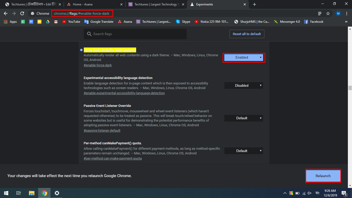 8. Enable করার সাথে সাথে ক্রোম আপনাকে রি-লাঞ্চ করার জন্য নোটিফিকেশন দিবে দিবে। Re-lunch বাটনে ক্লিক করে ক্রোম পুনরায় চালু করুন।