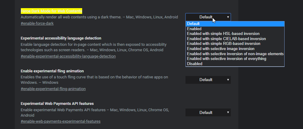 এছাড়াও আমি আরো বলেছি যে, এই ফিচারটি এখনও পুরোপুরি রিলিজ হয়নি, সুতরাং আপনি এই ফিচারটি মূল মেনুতে পাবেন না, তবে আপনি ব্রাউজারের অ্যাড্রেস বার থেকে এই ঠিকানাতে গিয়ে chrome://flags/#enable-force-dark এবং 'Enabled' অপশনটি সিলেক্ট করে দিলেই মুহূর্তেই ফোর্স ডার্ক মোড অন হয়ে যাবে।