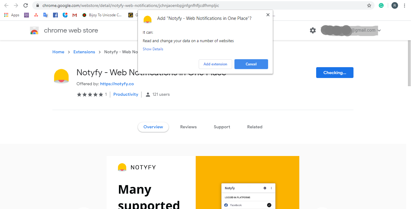 এখন Notyfy ইন্সটল করতে উপরের ডানদিকে Add to chrome বাটনে ক্লিক করলে, একটি পপআপ বাটনে আপনার ব্রাউজারে এক্সটেনশনটি ইন্সটল করার জন্য পারমিশন চাইবে তখন Add extension বাটনে ক্লিক করুন।