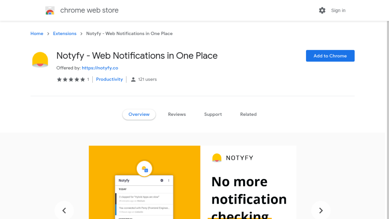 আশা করছি আপনারা গুগল ক্রোমে এক্সটেনশন ইন্সটল করতে হয় কিভাবে তা জানেন। তারপরেও ছোট্ট করে বলে দিচ্ছি Notyfy এর এই লিংকে ক্লিক করে সরাসরি Notyfy ইন্সটল পেইজে নিয়ে যাবে অথবা আপনি চাইলে গুগল ওয়েব স্টোরে গিয়ে সার্চ বক্সে Notyfy লিখে সার্চ করলেও Notyfy ইন্সটল পেইজে যেতে পারবেন। তো Notyfy ইন্সটল পেইজে গেলে আপনি নিচের মত একটা ইন্টারফেস দেখতে পারবেন।