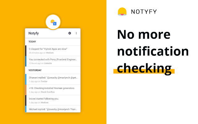 Notyfy হচ্ছে ক্রোম ব্রাউজারের জন্য ফ্রি এক্সটেনশন, যা ব্যবহার করে আপনি আপনার সোশ্যাল মিডিয়ার নোটিফিকেশন একটি ইন্ট্রিগ্রেট প্ল্যাটফর্মে দেখতে পাবেন। আর এই এক্সটেনশনে জনপ্রিয় সব সোশ্যাল মিডিয়া সাপোর্ট করে যার ফলে আপনি সহজেই সব নোটিফিকেশন জানতে পারবেন এক জায়গা থেকে। এই এক্সটেনশনে সাপোর্ট করে এমন কিছু জনপ্রিয় সোশ্যাল মিডিয়া গুলো হলঃ Gmail, Facebook, Quora, Twitter, Reddit, Medium, StackOverflow, LinkedIn, Product Hunt, এবং GitHub।