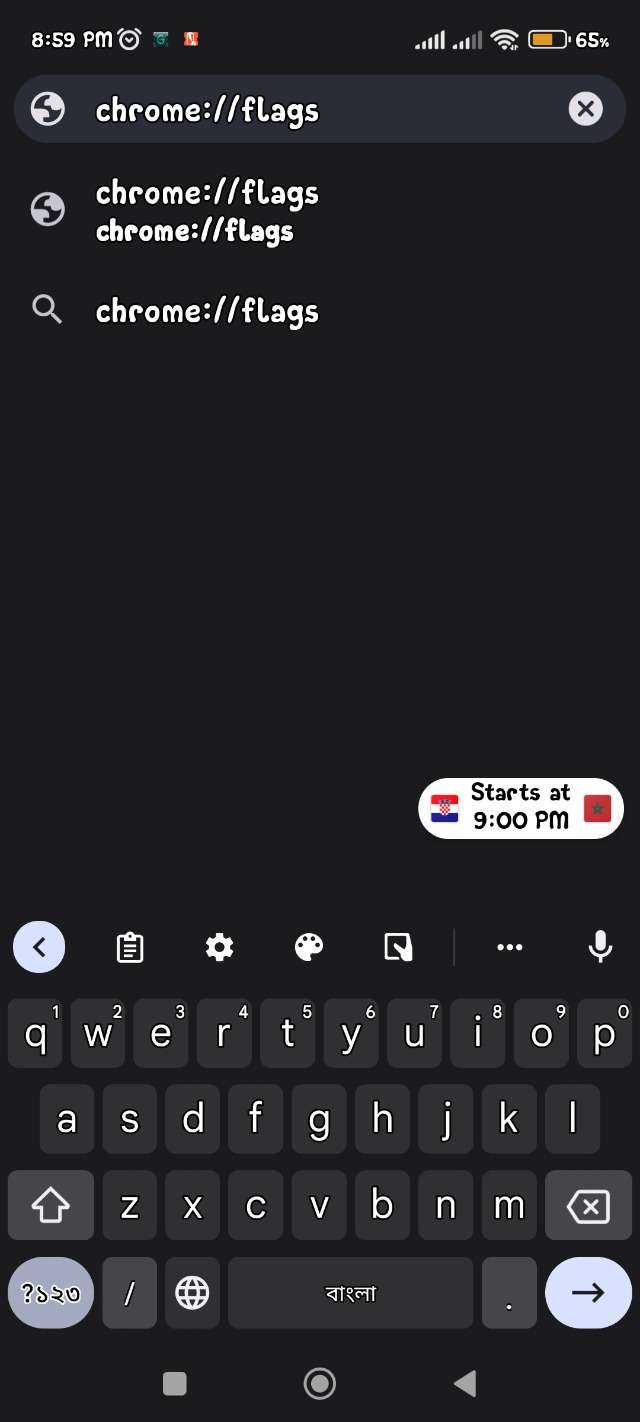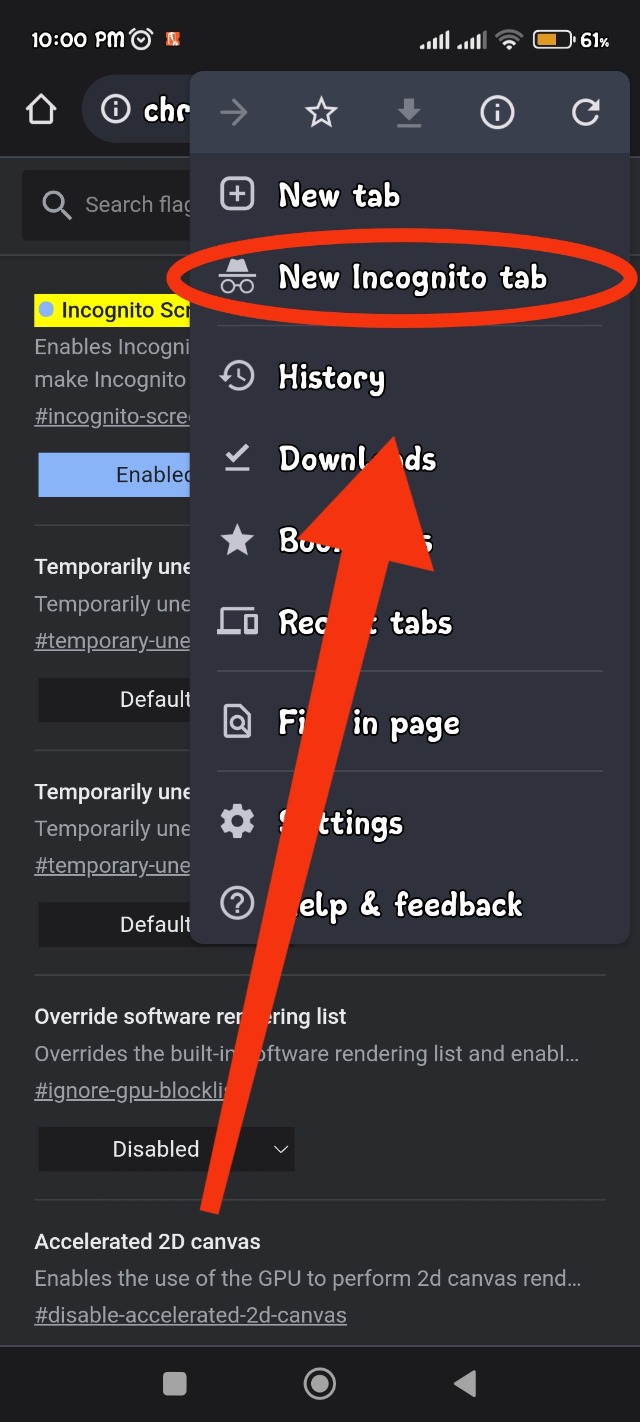 তো এই Incognito Mode ব্যবহার করতে যেয়ে আমরা প্রায়ই খুব বড়ো একটা সমস্যায় পড়ি। সেটা হচ্ছে আমরা এই মোড এ কোনো প্রকার স্ক্রিন শট নিতে পারিনা। কিন্ত আপনি যদি আমার আজকের এই ট্রিকস টি ফলো করেন তাহলে আপনি এখন থেকে Chrome এর Incognito Mode এও স্ক্রিন শট নিতে পারবেন। সেটা করার জন্যে আপনাকে প্রথমে আপনার ফোনের ক্রোম ব্রাউজার ওপেন করতে হবে। Open করে অ্যাড্রেস বারে chrome://flags এই লেখাটি কপি করে পেস্ট করে go করুন।