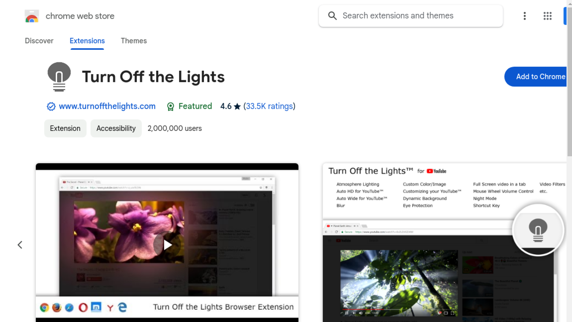 Turn Off The Lights একটি জনপ্রিয় ওয়েব ব্রাউজিং এক্সটেনশন। এটি ইউটিউব ভিডিও দেখতে কিংবা আপনার গুরুত্বপূর্ণ বিশেষ কিছু জিনিসের প্রতি মনোনিবেশ বৃদ্ধি করতে ব্যবহার করে। এই এক্সটেনশনটি ব্যবহার করার কারণে ভিডিও দেখার সময় আপনার মনোযোগ নষ্ট করা বা অনেক বেশি অ্যাডস আসা অথবা বেশি উচ্চস্বরে আসা শব্দগুলো দেখা বা শোনার থেকে দূরে রাখে।
